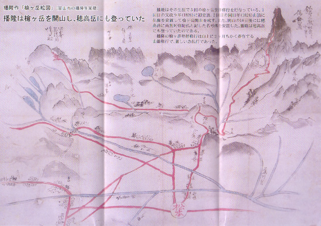 播隆上人は、立禅和尚の紹介により、信濃国小倉村(現安曇野市三郷小倉)の中田又重を道案内人として、安曇平から小倉村の鍋冠山・大滝山・蝶ヶ岳を経て、槍ヶ岳を目指しました。
